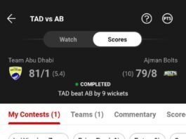 Winning screenshots TAD vs AJMB (Team Abu Dhabi vs Ajman Bolts), 1st Match Abu Dhabi T10 League 2024 Dream Team – Results