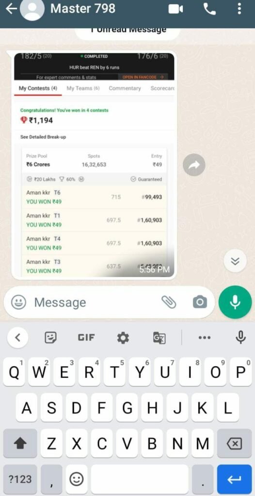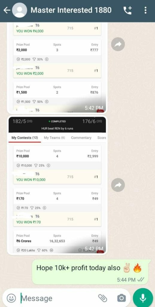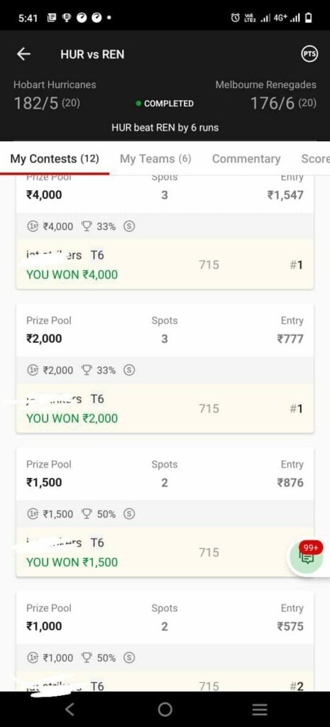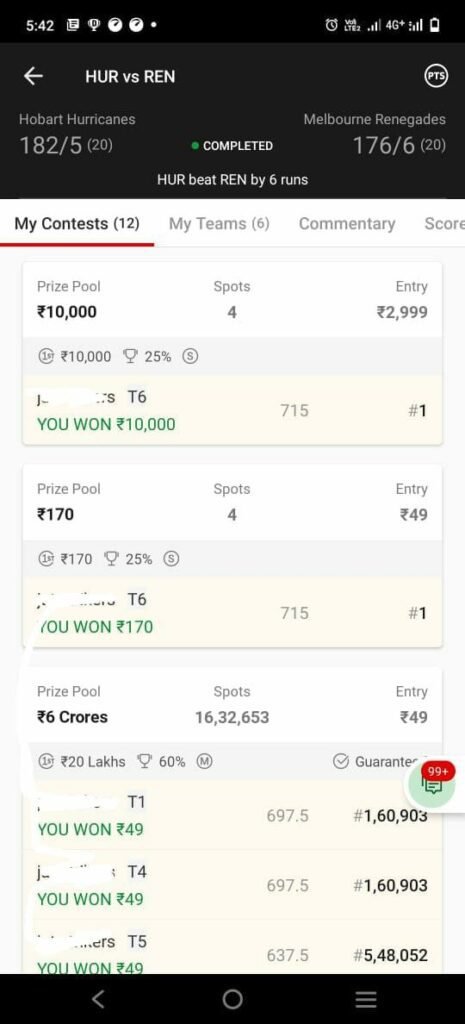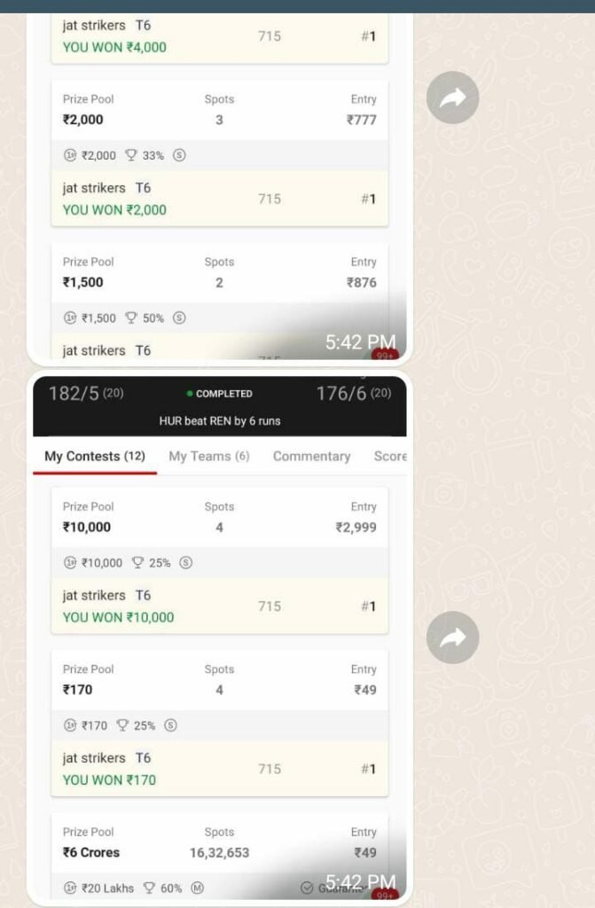 Here is the winning screenshots of  our teams won in Dream 11 ,