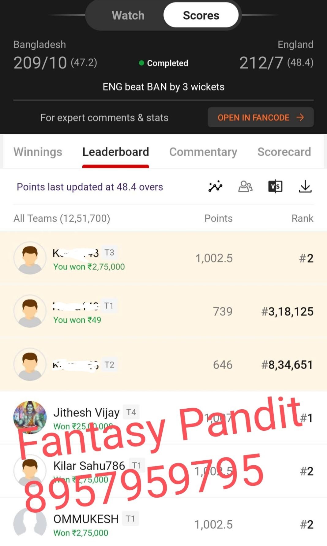 Winning screenshot, ENG VS BAN , Dream Team
