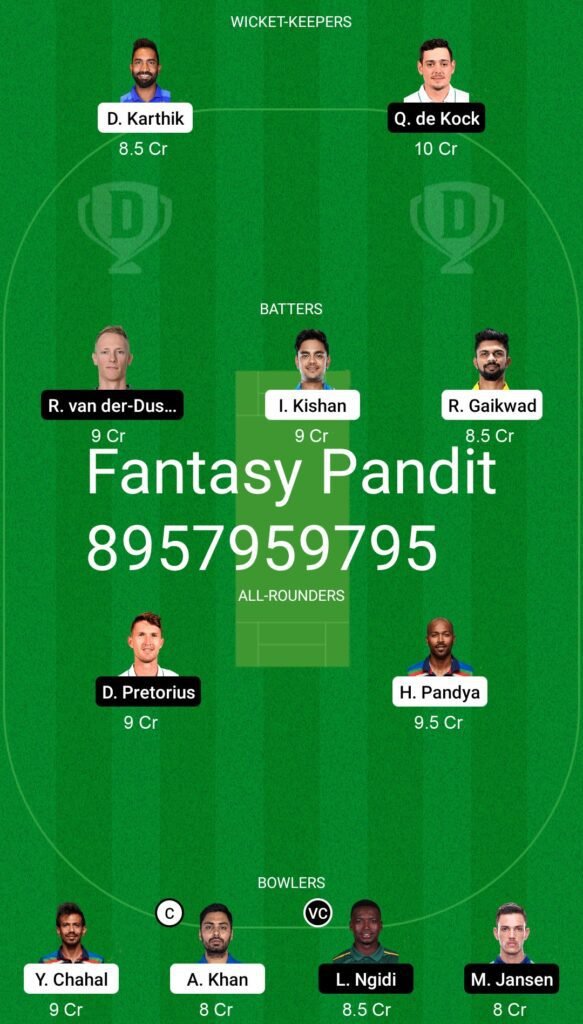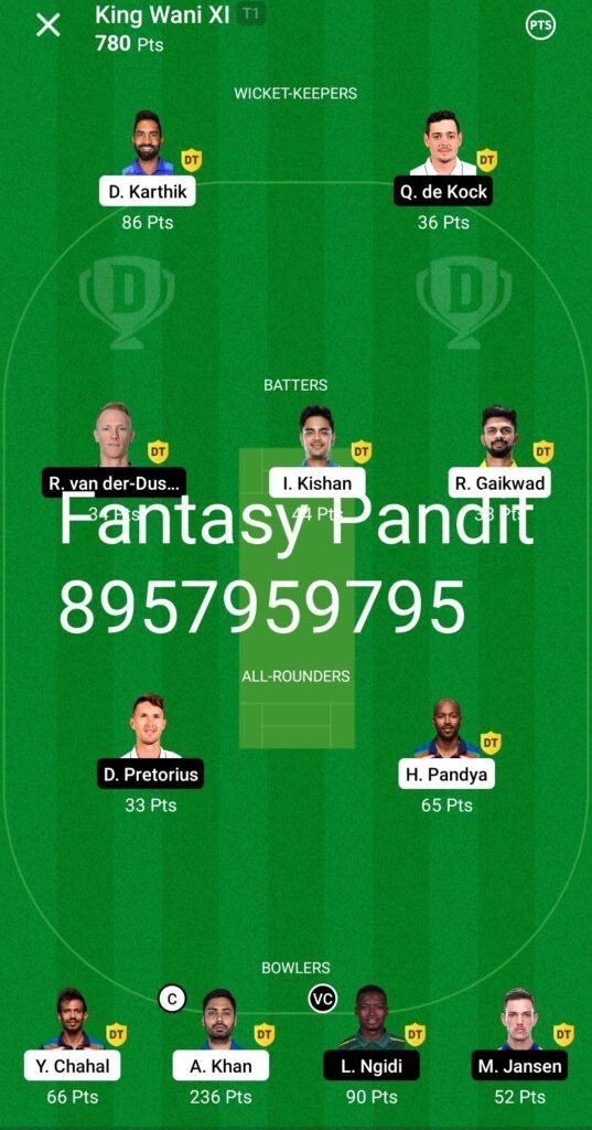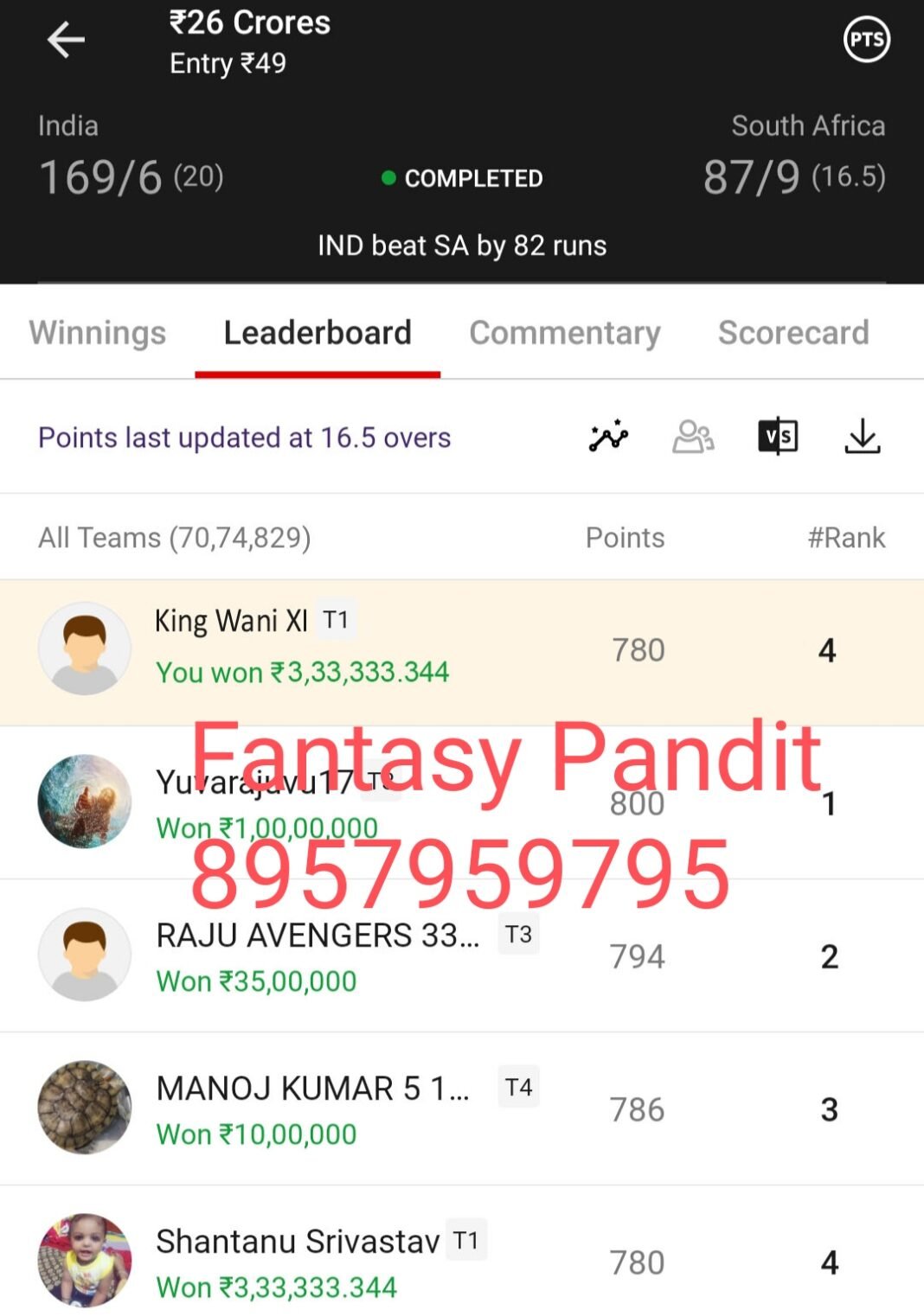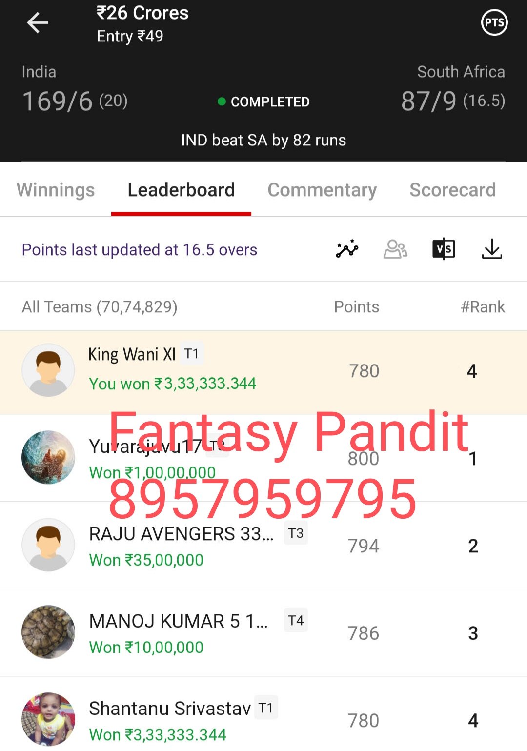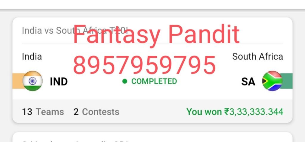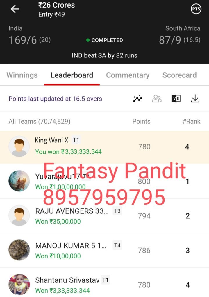 Winning screenshot, IND VS SA , Dream Team